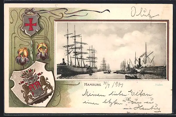 Passepartout-Lithographie Hamburg, Hafen, Wappen