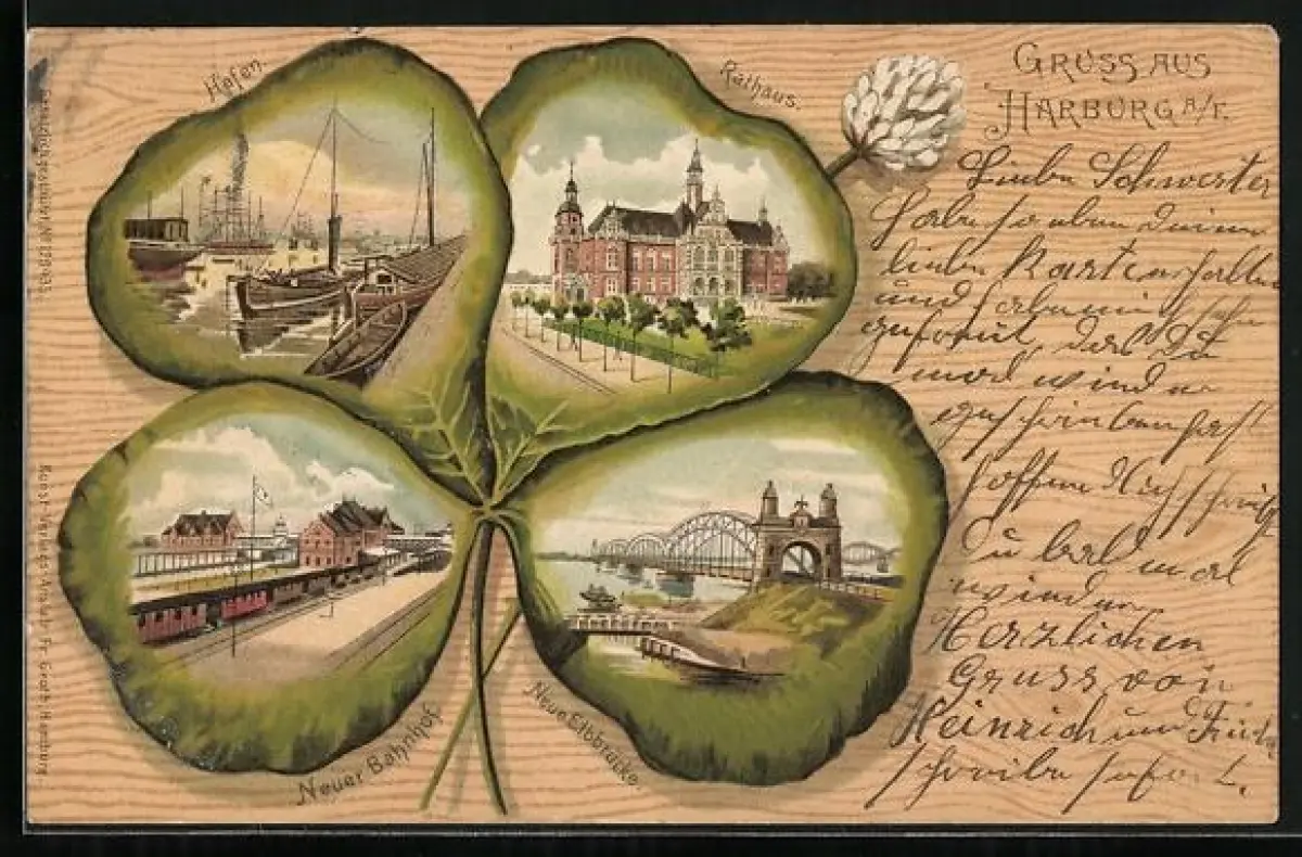Passepartout-Lithographie Hamburg-Harburg, Hafen, Neuer Bahnhof, Rathaus, Kleeblatt