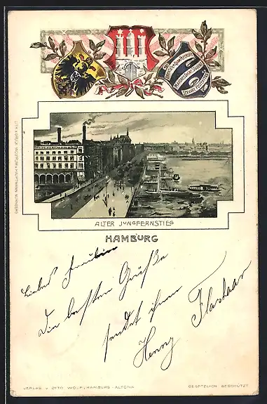 Passepartout-Lithographie Hamburg-Neustadt, Alter Jungfernstieg, Wappen und Lorbeerzweig