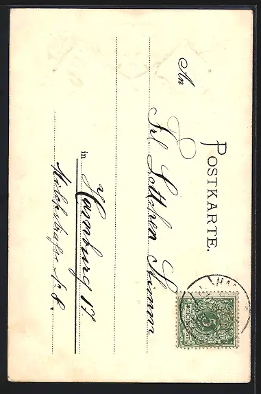 Personenbezogene Daten auf der Rückseite der Karte wurden durch blauen Textmarker unkenntlich gemacht. Die blauen Stellen sind auf die Vorderseite durchgeweicht und wirken sich negativ auf das Postkartenfoto aus