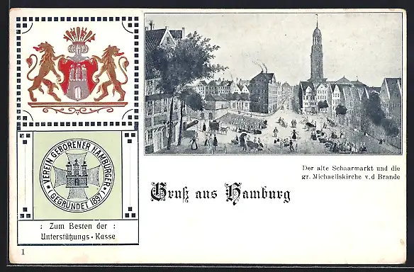 Passepartout-Lithographie Hamburg-Neustadt, Der alte Schaarmarkt und die gr. Michaeliskirche v. d. Brande, Wappen