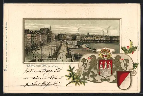Passepartout-Lithographie Hamburg-Neustadt, Jungfernstieg mit Booten, Wappen