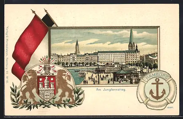 Passepartout-Lithographie Hamburg-Neustadt, Passanten am Jungfernstieg, Wappen und Fahnen