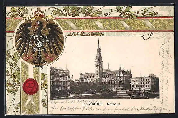 Passepartout-Lithographie Hamburg, Partie am Rathaus, Reichsadler mit Wappen und Eichenzweig