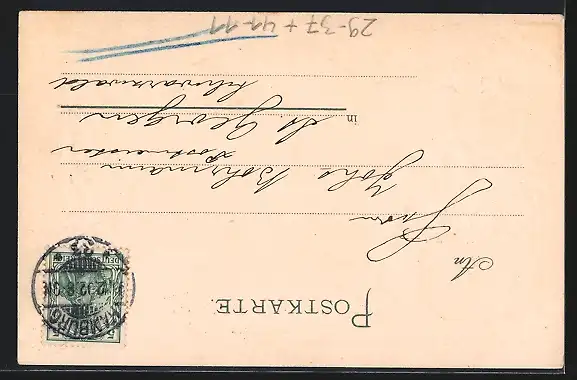 Personenbezogene Daten auf der Rückseite der Karte wurden durch blauen Textmarker unkenntlich gemacht. Die blauen Stellen sind auf die Vorderseite durchgeweicht und wirken sich negativ auf das Postkartenfoto aus
