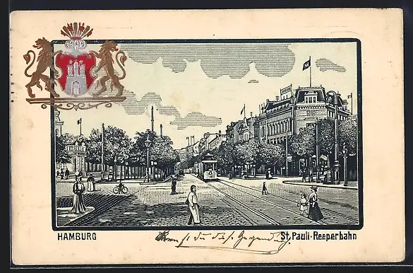 Passepartout-Lithographie Hamburg-St. Pauli, Strassenbahn auf der Reeperbahn, Wappen