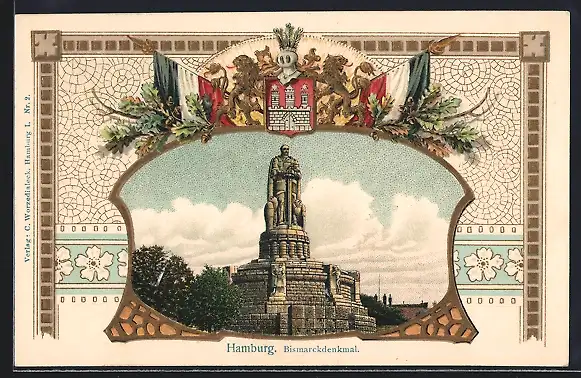 Passepartout-Lithographie Hamburg-St.Pauli, Blick auf das Bismarckdenkmal, Wappen mit Reichsfahnen und Eichenzweigen