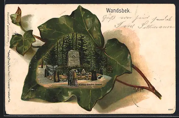 Passepartout-Lithographie Hamburg-Wandsbek, Matthias Claudius-Denkmal im Efeublatt