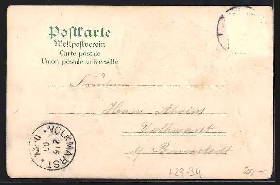 gelaufen 1905, rückseitig Oberflächenschaden, Briefmarke entfernt, guter Zustand
