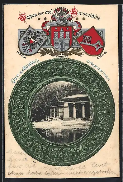 Passepartout-Lithographie Hamburg, Zoologischer Garten, Wappen mit Ritterhelm