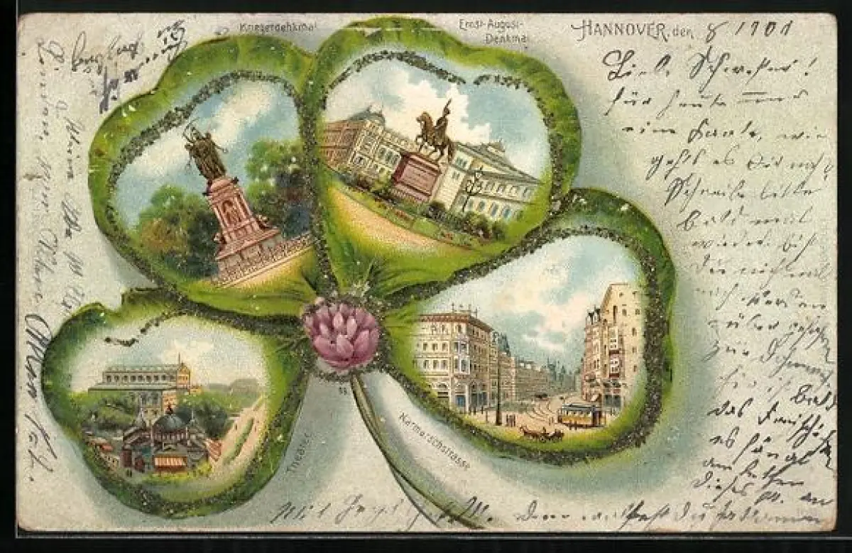 Passepartout-Lithographie Hannover, Theater, Kriegerdenkmal, Ernst-August-Denkmal, Karmarschstrasse, Kleeblatt