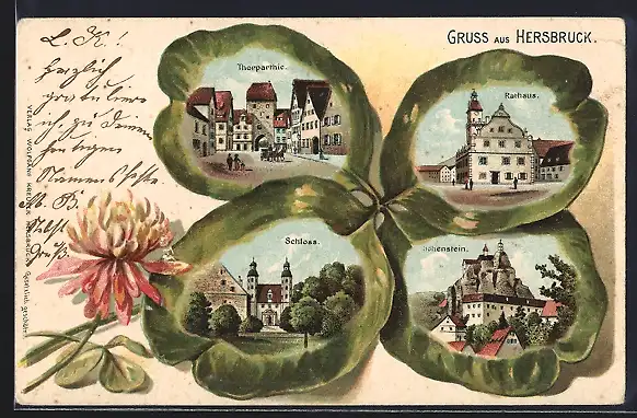 Passepartout-Lithographie Hersbruck, Rathaus, Torpartie, Schloss, Hohenstein im Kleeblatt