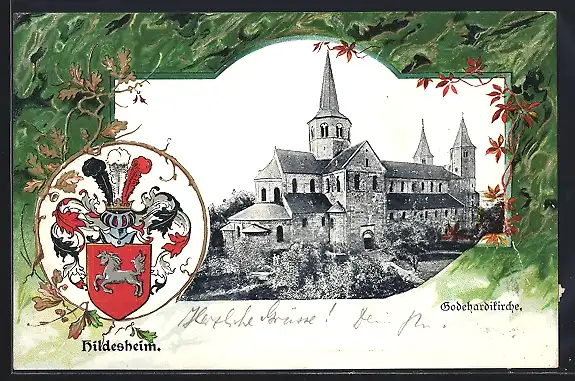 Passepartout-Lithographie Hildesheim, Godehardikirche und Wappen mit Adler und Harnisch
