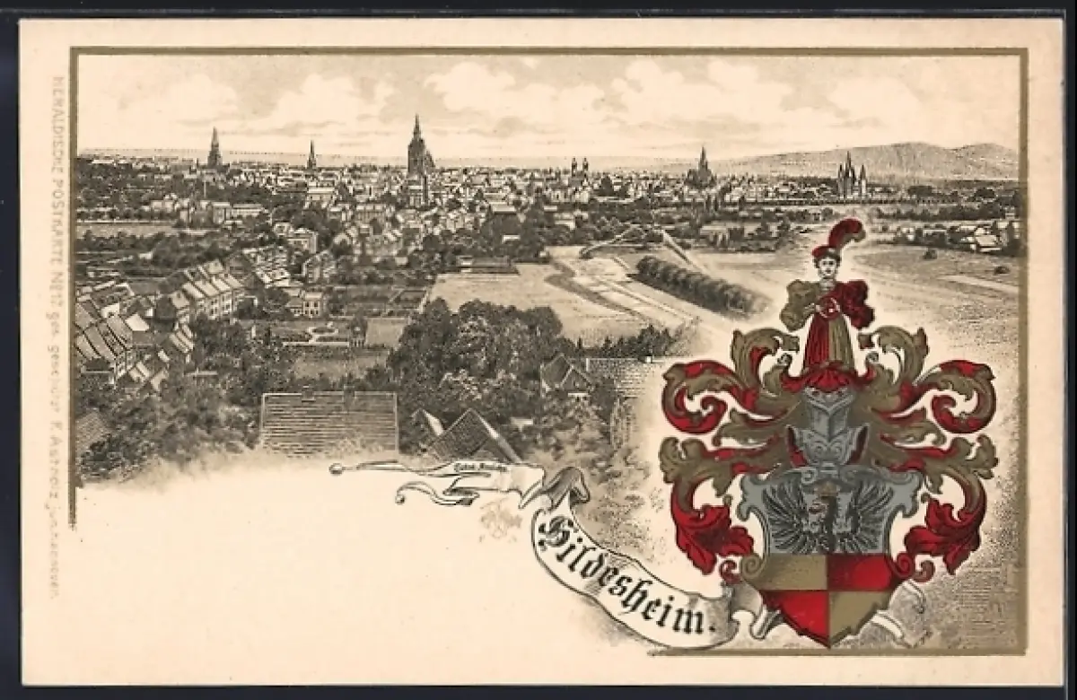 Passepartout-Lithographie Hildesheim, Teilansicht, Ritterhelm mit Wappen