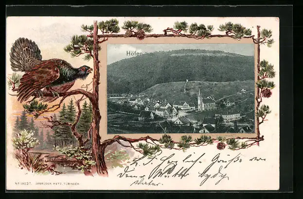 Passepartout-Lithographie Höfen, Teilansicht, Auerhahne auf einem Ast