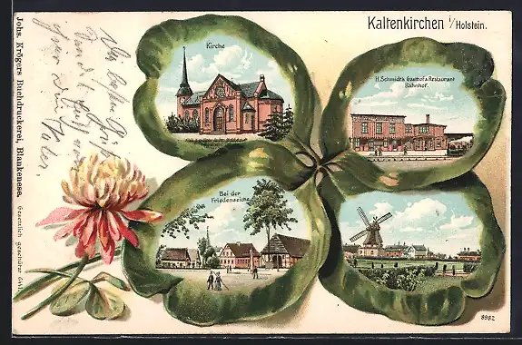 Passepartout-Lithographie Kaltenkirchen, Kirche, Friedenseiche, Bahnhof, Windmühle, Kleeblatt