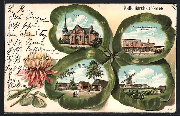 Passepartout-Lithographie Kaltenkirchen i. Holstein, Gasthof & Restaurant zum Bahnhof, Kirche und Windmühle im Kleeblatt
