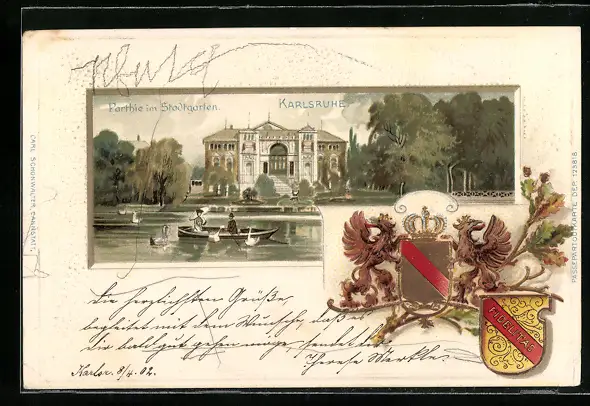 Passepartout-Lithographie Karlsruhe, Partgie im Stadtgarten und Wappen