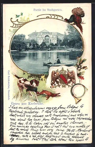 Passepartout-Lithographie Karlsruhe, Partie im Stadtgarten, Jagdhund und Wappen