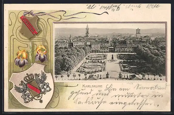 Passepartout-Lithographie Karlsruhe, Totalansicht, Wappen und Schwertlilie