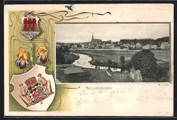 Passepartout-Lithographie Kellinghusen, Teilansicht mit Kirche, Wappen
