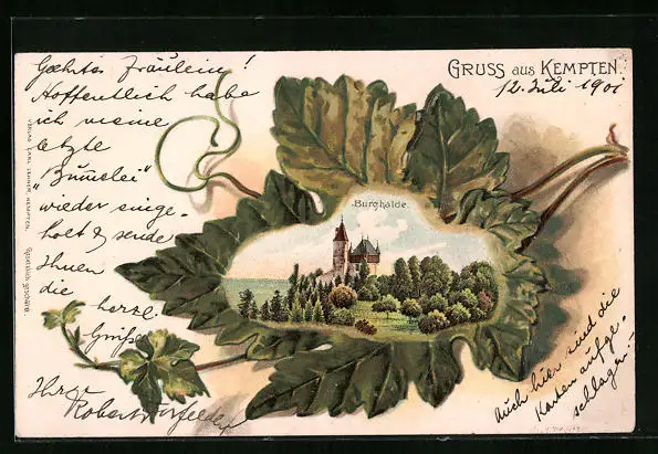Passepartout-Lithographie Kempten, Burghalde im Eichenblatt
