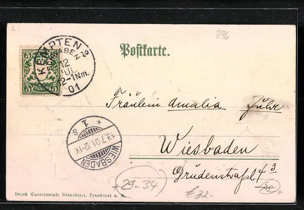 Personenbezogene Daten auf der Rückseite der Karte wurden durch blauen Textmarker unkenntlich gemacht. Die blauen Stellen sind auf die Vorderseite durchgeweicht und wirken sich negativ auf das Postkartenfoto aus