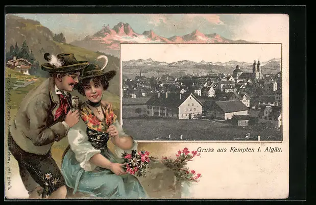 Passepartout-Lithographie Kempten i. Allgäu, Teilansicht mit Kirche, Paar in Tracht