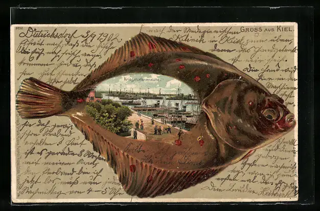 Passepartout-Lithographie Kiel, Ansicht des Kriegshafens, Kriegsschiffe, Fisch