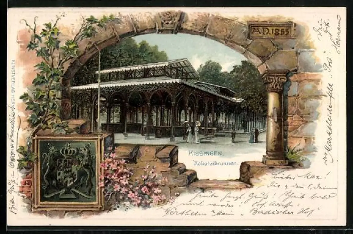 Passepartout-Lithographie Kissingen, Kurgäste am Rakotzibrunnen, Wappen