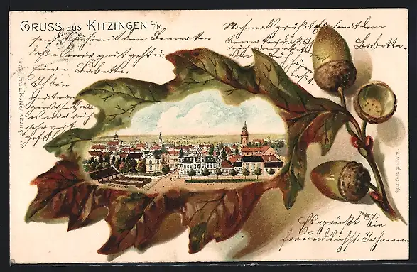 Passepartout-Lithographie Kitzingen, Panorama im Eichenblatt