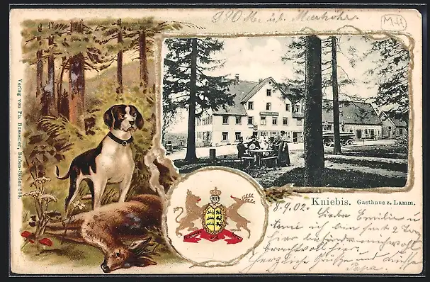 Passepartout-Lithographie Kniebis, Gasthaus zum Lamm, Wappen, Jagdhund mit erlegtem Rehbock