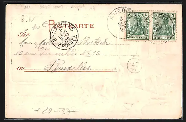 Personenbezogene Daten auf der Rückseite der Karte wurden durch blauen Textmarker unkenntlich gemacht. Die blauen Stellen sind auf die Vorderseite durchgeweicht und wirken sich negativ auf das Postkartenfoto aus