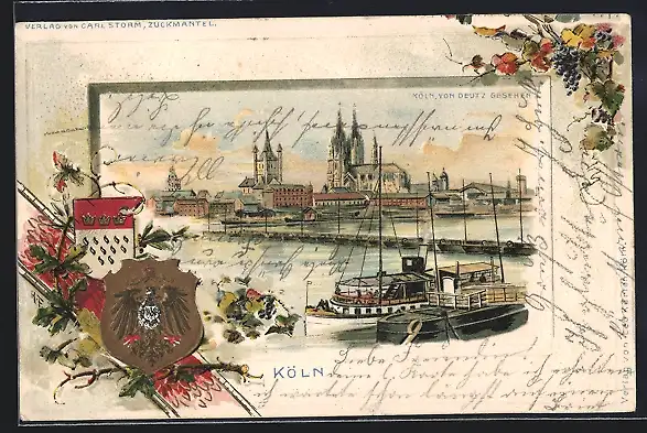 Passepartout-Lithographie Köln, Blick zur Stadt von Deutz gesehen, Segelschiffe, Wappen