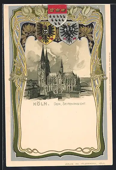Passepartout-Lithographie Köln, Dom, Seitenansicht, Wappen
