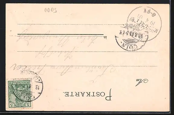 Personenbezogene Daten auf der Rückseite der Karte wurden durch blauen Textmarker unkenntlich gemacht. Die blauen Stellen sind auf die Vorderseite durchgeweicht und wirken sich negativ auf das Postkartenfoto aus