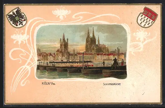 Passepartout-Lithographie Köln a. Rh., Schiffsbrücke und Kirche, Wappen
