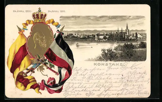 Passepartout-Lithographie Konstanz, Uferpartie mit Kirche, Portrait mit Fahnen, 1852-1902