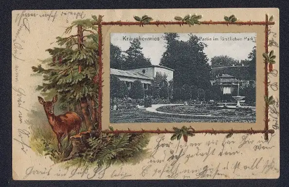 Passepartout-Lithographie Krauchenwies, Partie im fürstlichen Park, Reh auf der Wiese