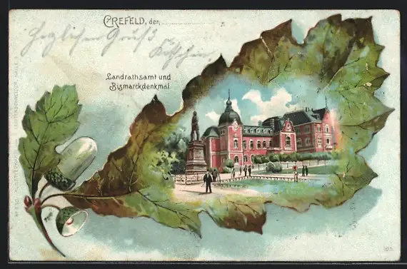 Passepartout-Lithographie Krefeld, Landratsamt & Bismarckdenkmal
