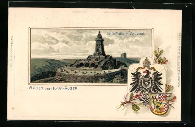 Passepartout-Lithographie Kyffhäuser, Kaiser-Wilhelm-Denkmal mit geprägten Wappen