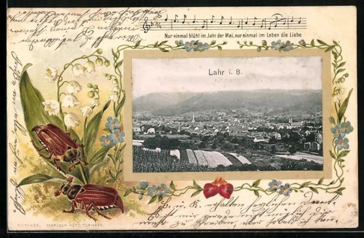 Passepartout-Lithographie Lahr i. B., Ortsansicht aus der Vogelschau, Maikäfer