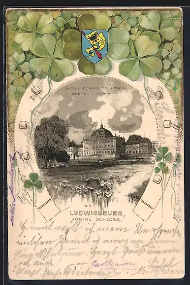 Passepartout-Lithographie Ludwigsburg / Württ., Königliches Schloss mit Corps de Logis im Hufeisen, Wappen