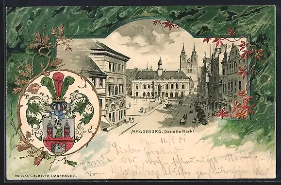 Passepartout-Lithographie Magdeburg, Der alte Markt, Wappen und Eichenzweig