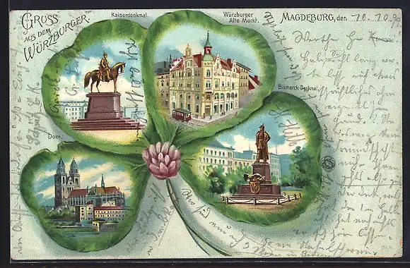 Passepartout-Lithographie Magdeburg, Kaiserdenkmal, Bismarck-Denkmal, Dom, Würzburger Alte Markt, Dom, Kleeblatt