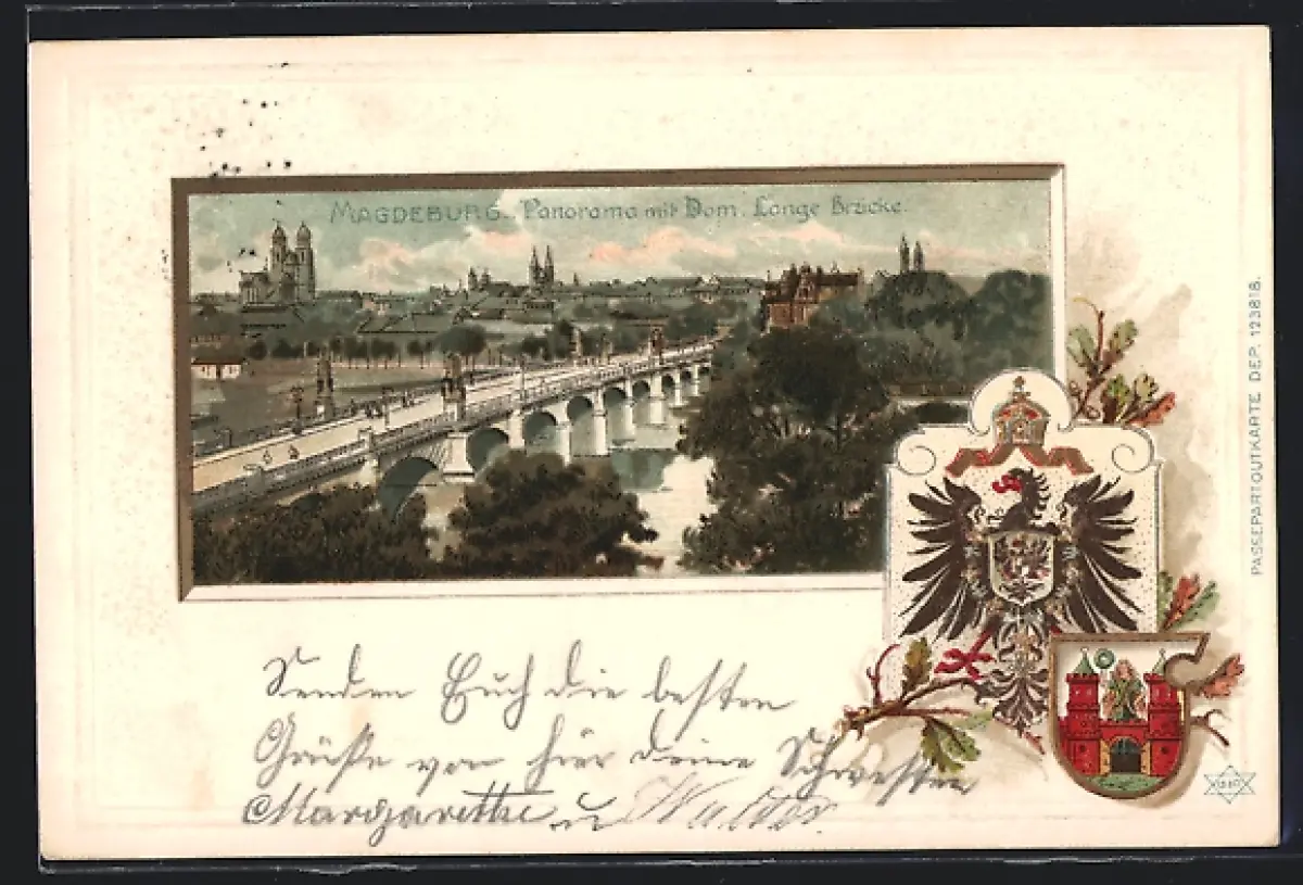 Passepartout-Lithographie Magdeburg, Panorama mit Dom, Lange Brücke, Wappen