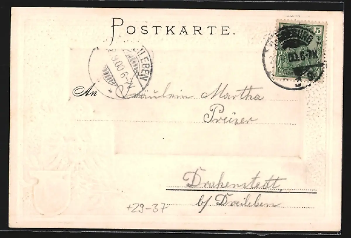 Personenbezogene Daten auf der Rückseite der Karte wurden durch blauen Textmarker unkenntlich gemacht. Die blauen Stellen sind auf die Vorderseite durchgeweicht und wirken sich negativ auf das Postkartenfoto aus