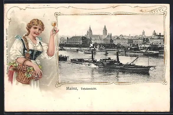Passepartout-Lithographie Mainz, Hafenpartie mit Schiffen, Frau mit Weinglas & Korb