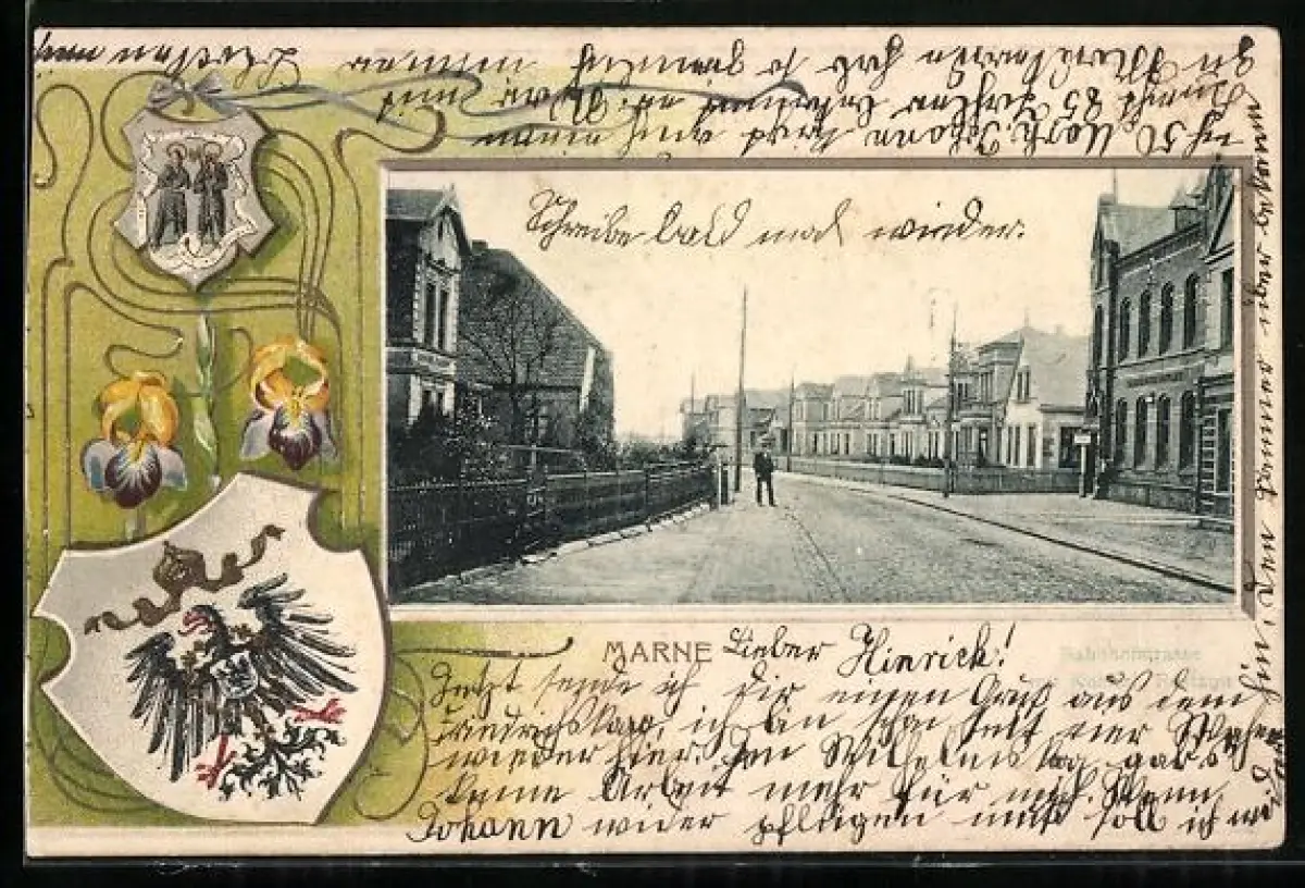 Passepartout-Lithographie Marne / Holstein, Strassenpartie, Wappen