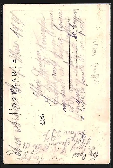 Personenbezogene Daten auf der Rückseite der Karte wurden durch blauen Textmarker unkenntlich gemacht. Die blauen Stellen sind auf die Vorderseite durchgeweicht und wirken sich negativ auf das Postkartenfoto aus